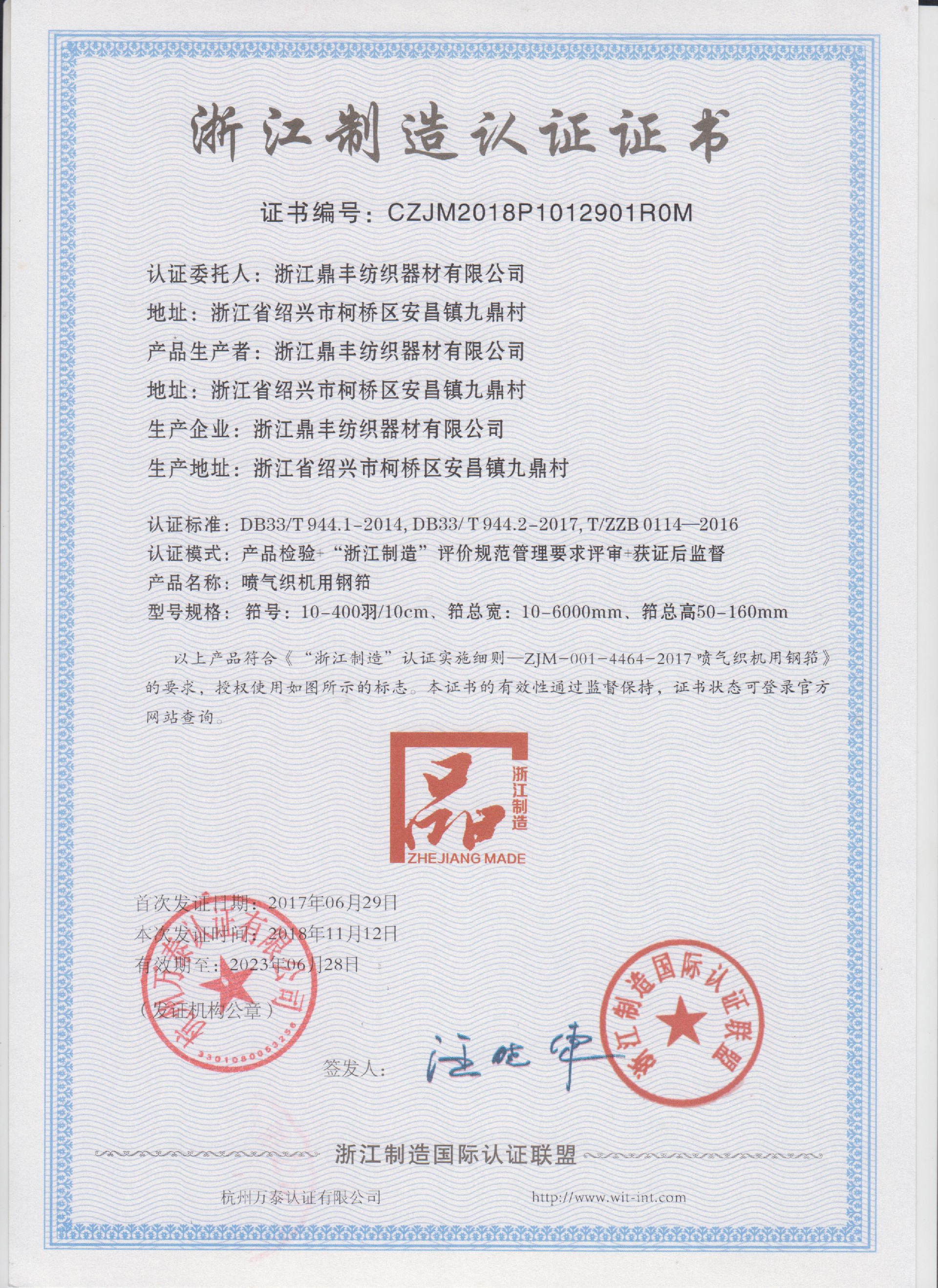 <p>&nbsp;浙江鼎丰纺织器材有限公司始建于1986年，是一家专业生产各类无梭织机用钢筘：喷气筘、喷水筘、剑杆筘、其他类型钢筘；铝合金综框、钢片综、停经片、经轴、织轴、卷布辊等产品及配件的民营企业。</p><p>&nbsp;公司现有固定资产6000余万元，员工300余人，现具有年产喷气异型筘12万米，剑杆筘32万米，喷水筘5万米，综框20万片，钢片综2亿片，停经片1.5亿片, 织轴1.2万套的生产能力。公司“越泉”商标被评为“中国驰名商标”。公司通过ISO9001 :2015国际质量体系认证，ISO14001:2015国际环境管理体系认证，ISO45001:2018国际职业健康安全管理体系认证，喷气织机用钢筘和织机用铝合金综框获得“浙江制造”品牌认证，公司拥有自营进出口权，产品畅销全国并远销印度、巴基斯坦、土耳其、埃及、哥伦比亚、意大利等国家和地区。</p><p>&nbsp;2005年投资新建了浙江鼎丰铝业有限公司，2016年鼎丰企业实现销售收入16亿元。</p><p>&nbsp;公司坐落在绍兴安昌古镇，交通十分便利，距中国轻纺城(柯桥) 8公里，杭州萧山国际机场8公里，配套的产品，一条龙的服务，公司愿与世界各地纺织企业携手合作，共创锦绣前程。</p><p><br/></p>